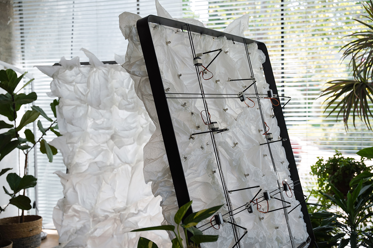 NO MIND is a display that illustrates the process of meditation. The system detects when a meditator reaches optimal concentration using EEG electrodes placed on the head. The display responds accordingly through a visual and audio performance.