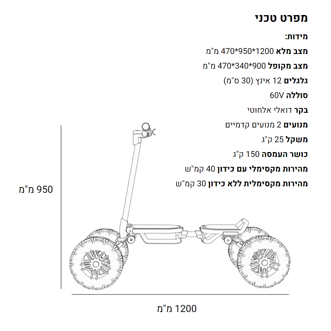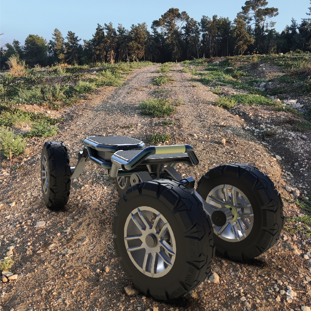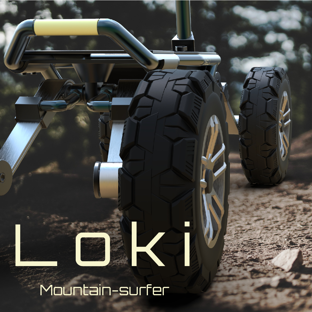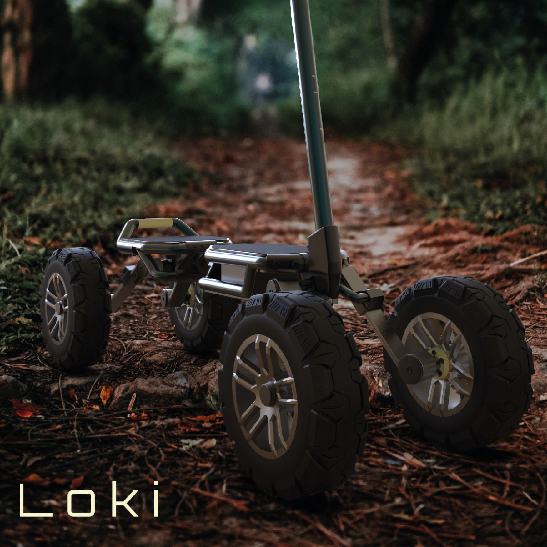 Loki, an electric off-road vehicle, is adapted to harsh terrain conditions and unconventional performance due to its rear-wheel steering and front-wheel drive. Its size is suitable for transport in a private car, without requiring accessories. Presents a challenge to every rider, whatever his/her level.