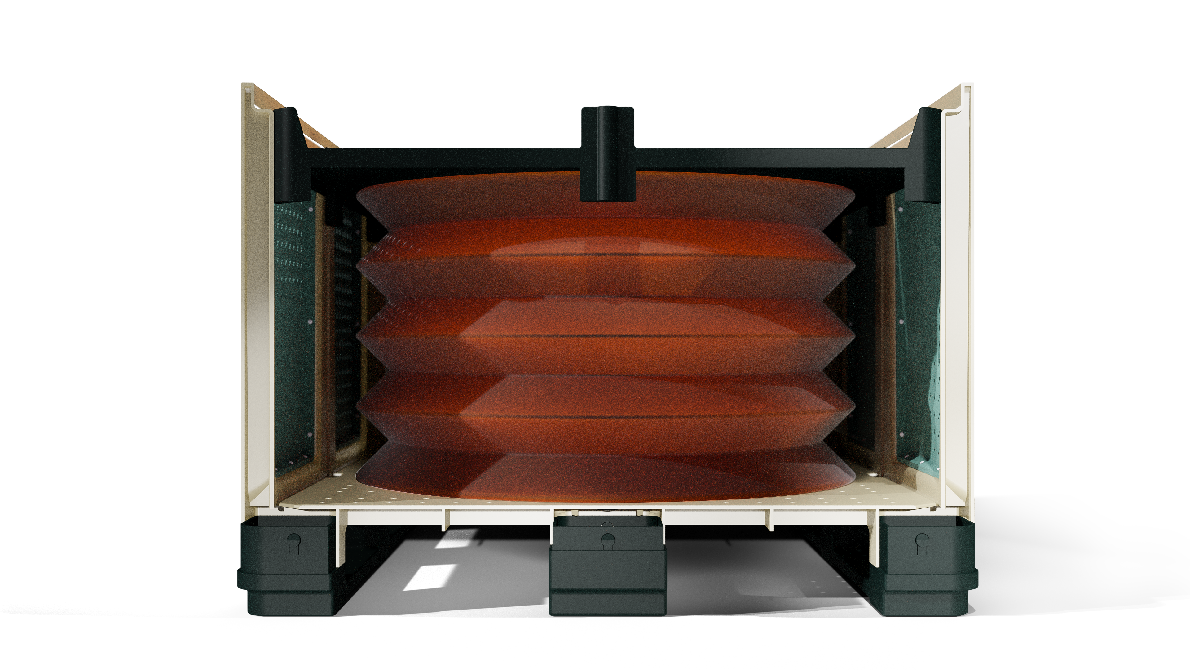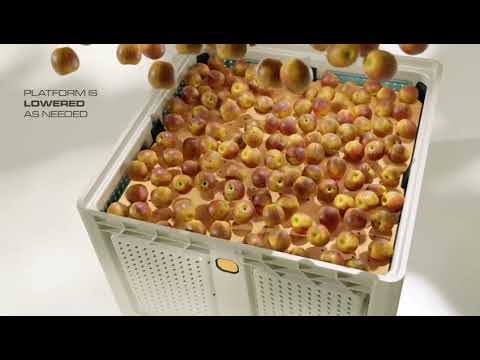 מכל קטיף לתפוחים שפותר את בעיית פגיעות המעיכה בפרי בזמן פריקה ושינוע באמצעות במה יורדת וקירות רכים. תזוזת הבמה מאפשרת פריקה בגובה אחיד, והקירות הרכים סופגים זעזועים כשהמֵכל מלא.