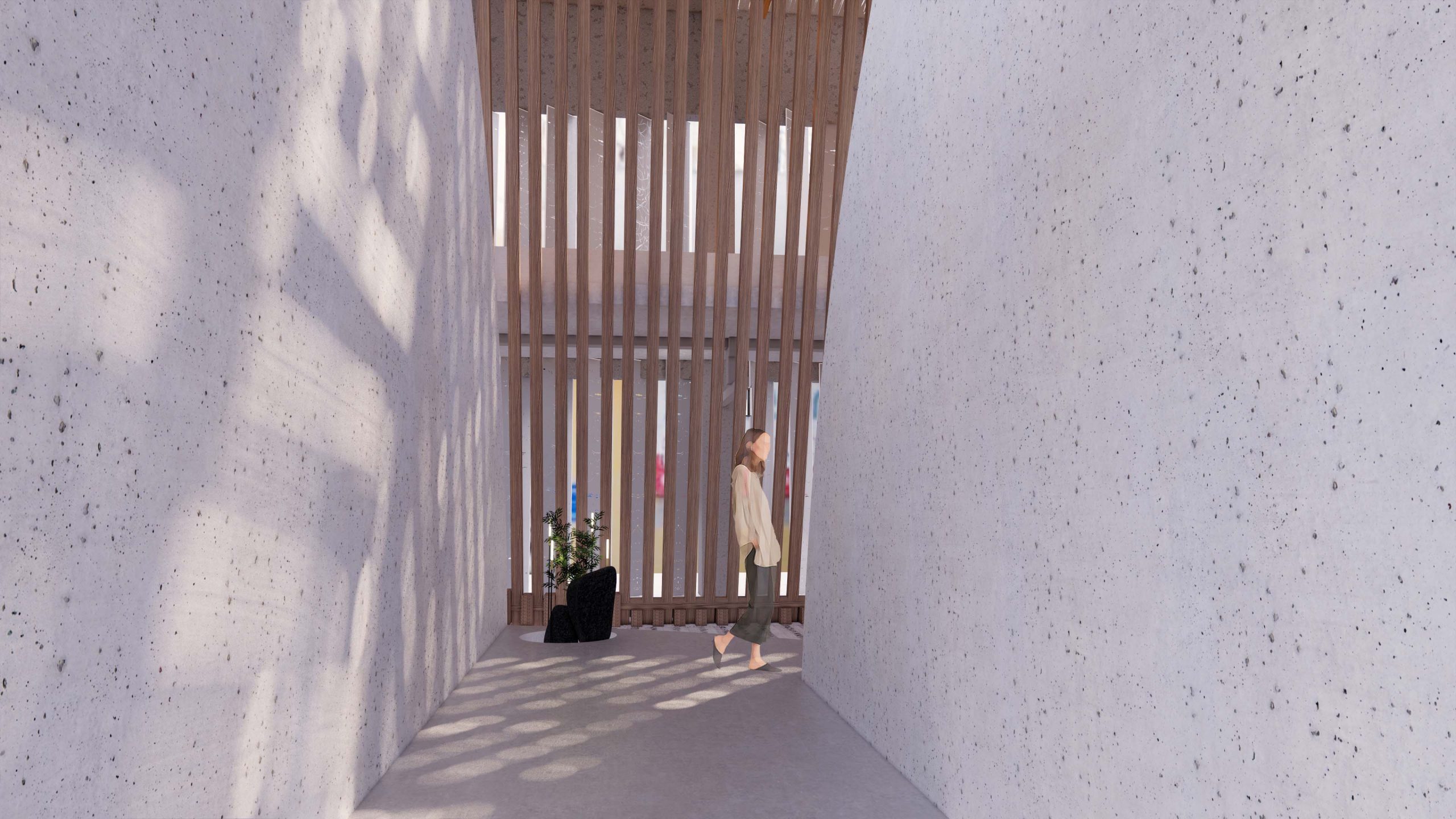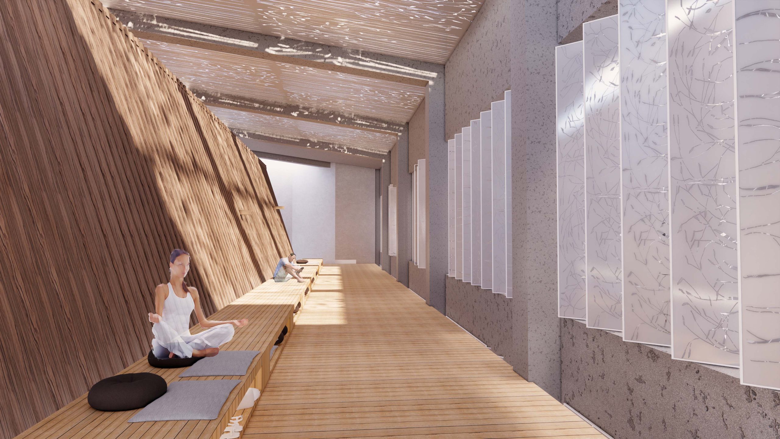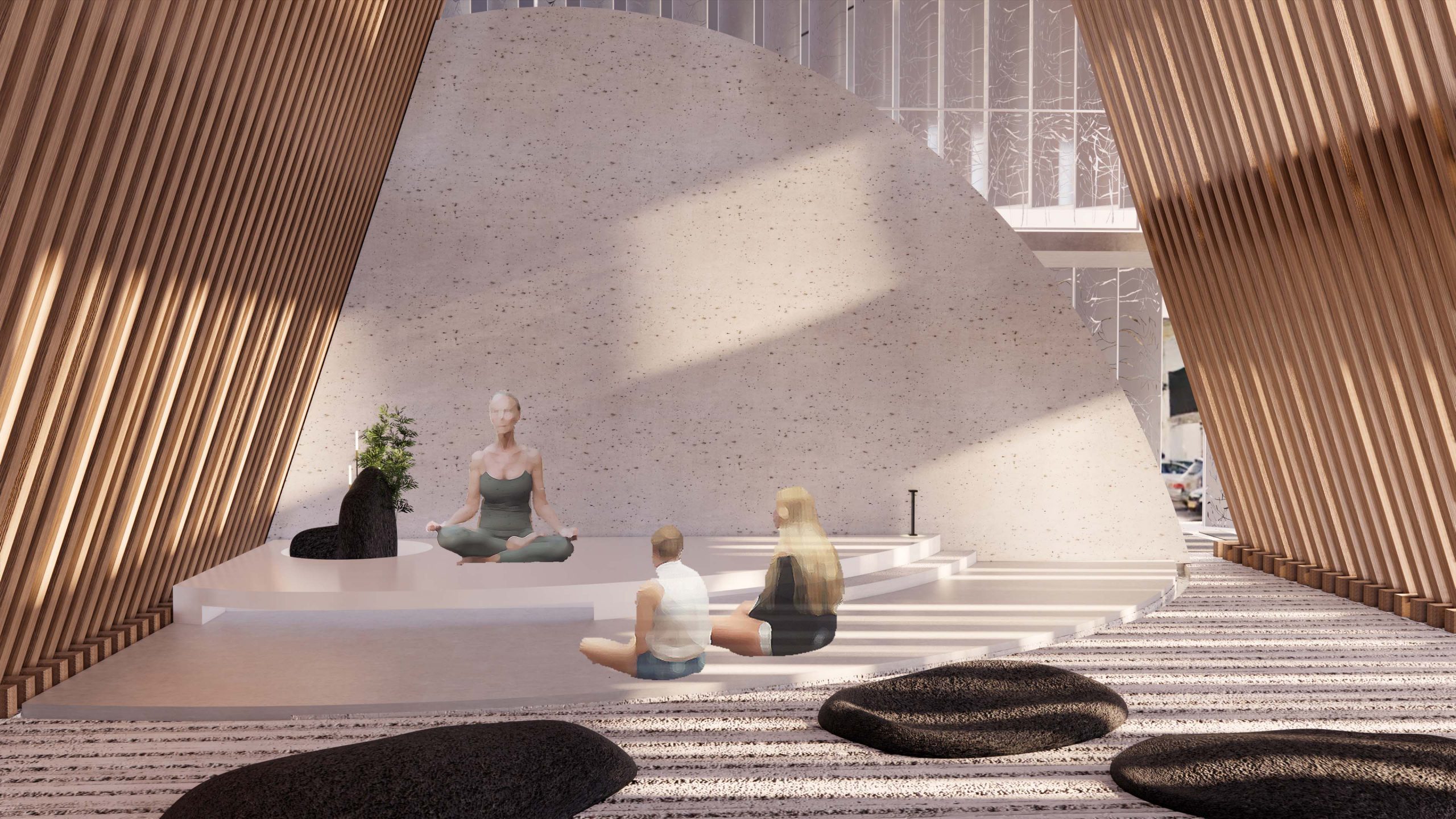 מרחב פתוח המאפשר לעצור לרגע מחיי היום-יום ולבצע פעילות מדיטטיבית על פלטפורמות שונות; חוויית המרחב מקנה שקט להקשבה עצמית על רקע צלילי המרחב העירוני.