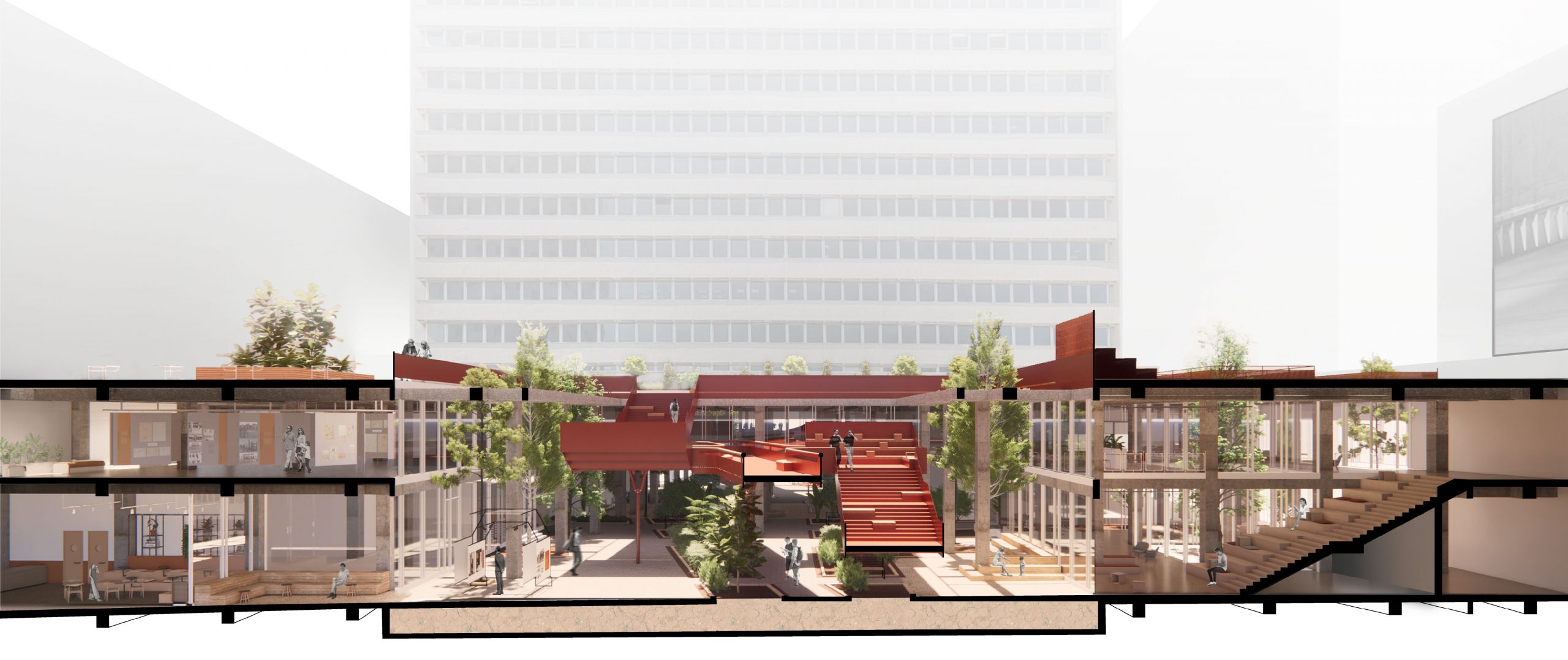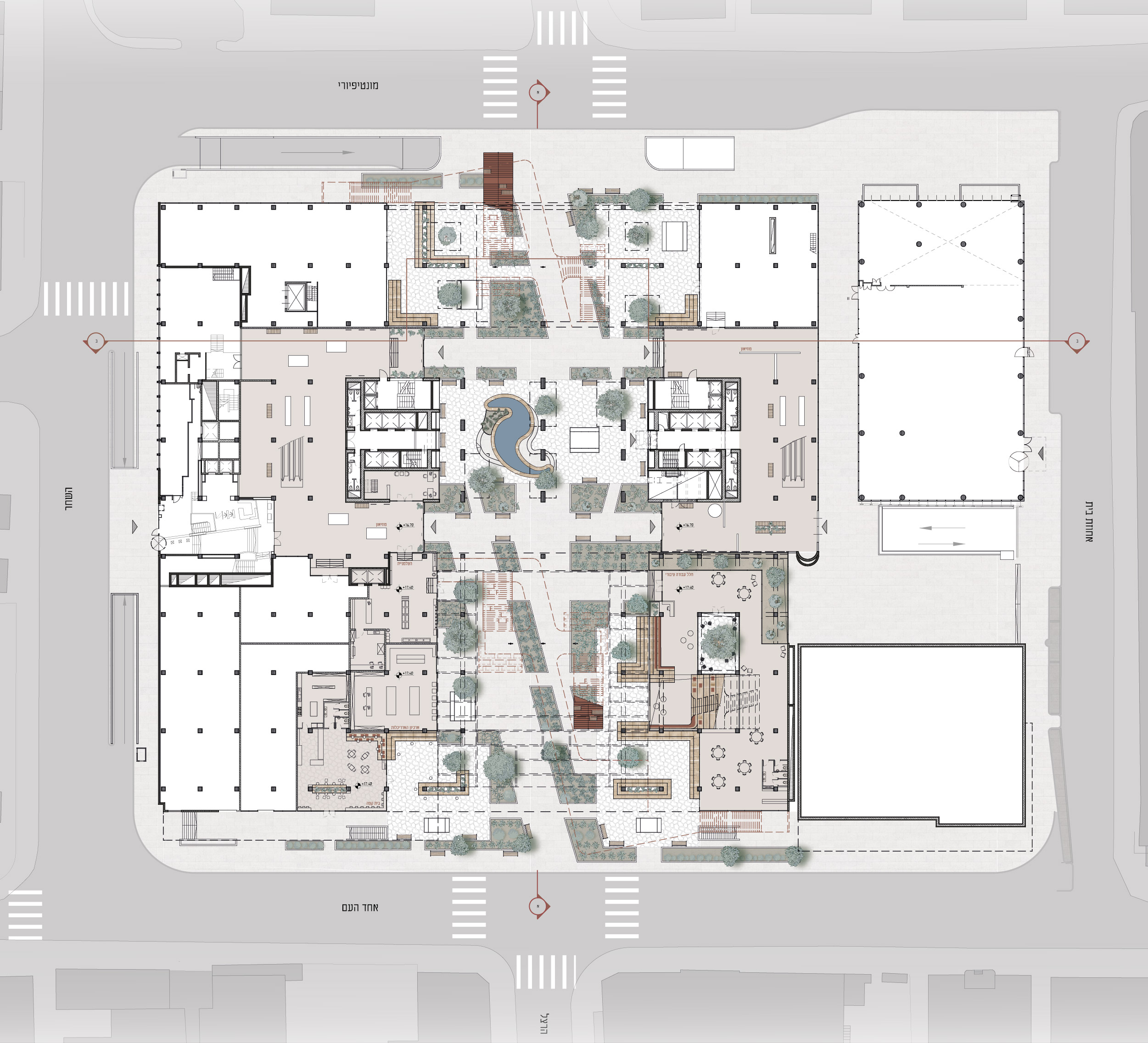 A public space in the Migdal Shalom Tower that was built on the ruins of the first public building in Tel Aviv – the Herzliya Hebrew Gymnasium. The place is designed as a garden to take a breather from city life, combined with a museum that presents the story of how it was built and that hosts urban cultural events.