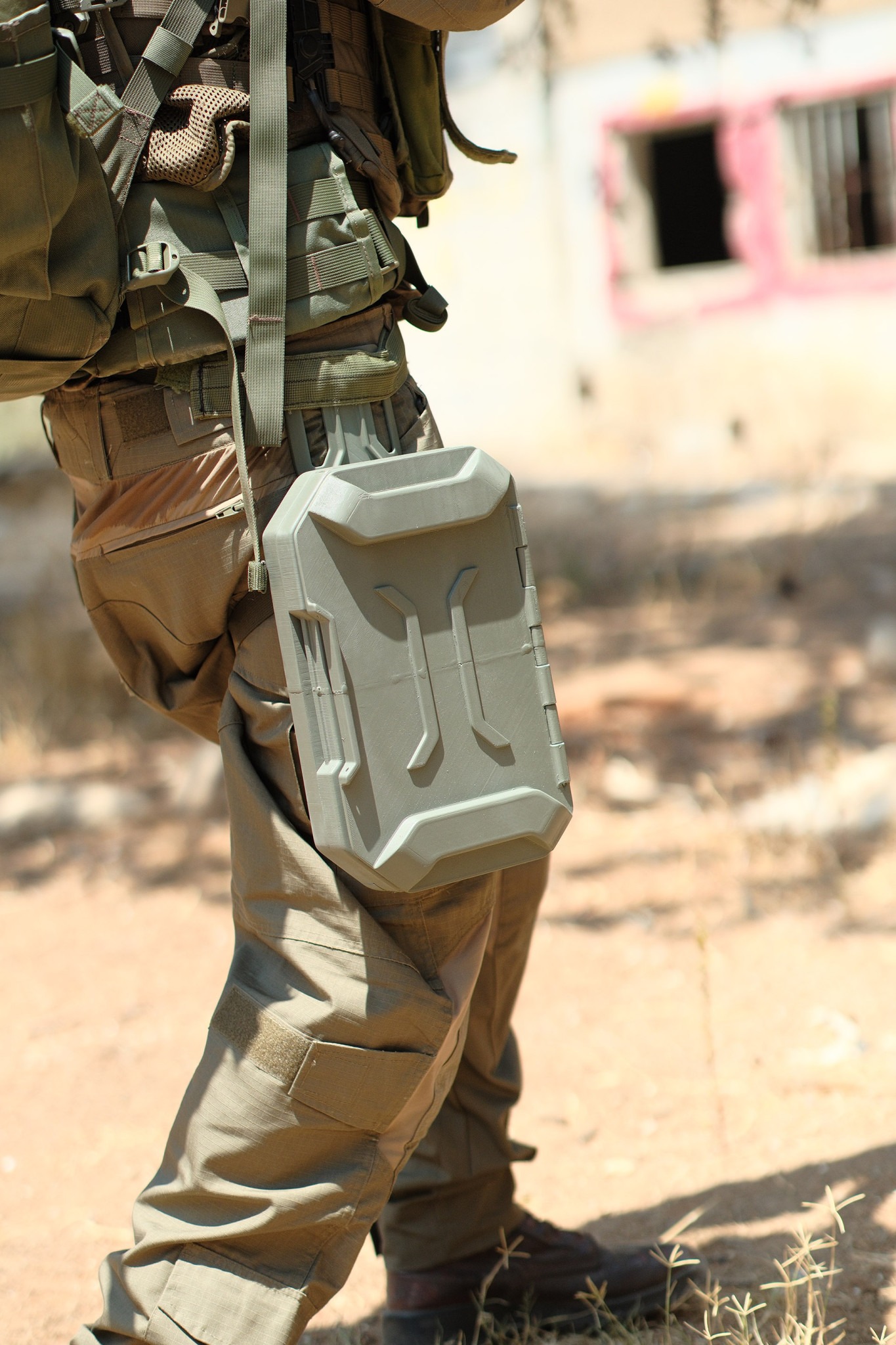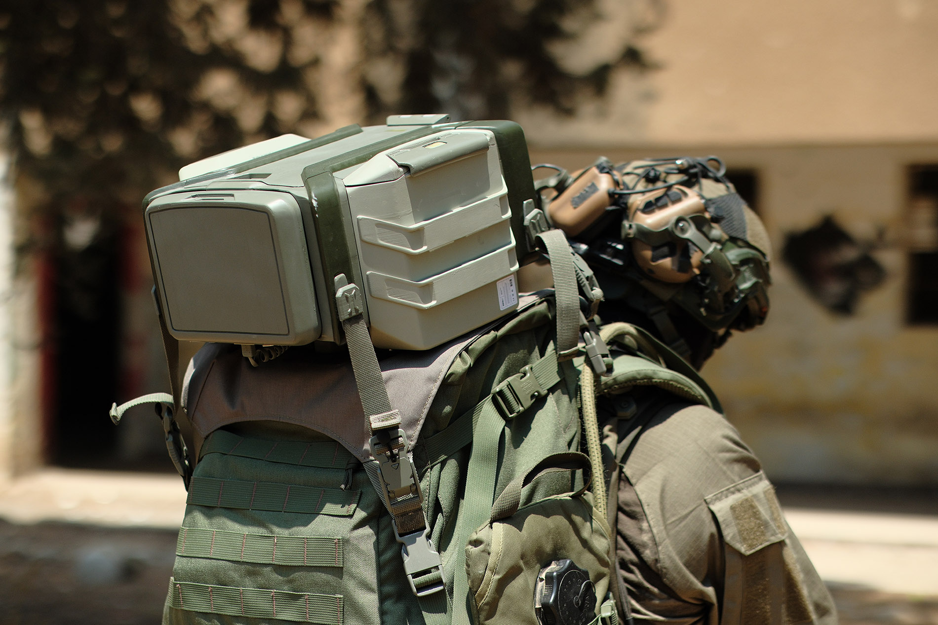 An operational carrier for a drone and its operational tools for infantry forces in combat. The carrier is designed to adapt the drone for the battlefield and optimize its use. It features two different carrying modes and an integrated command screen.