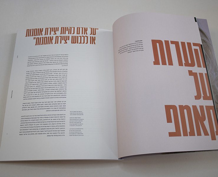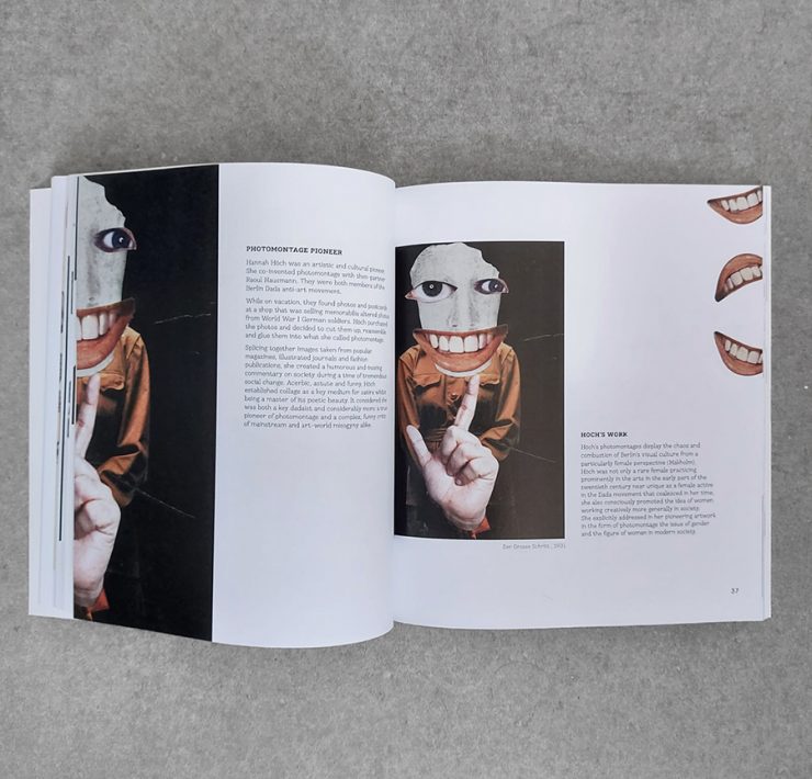 את הקטלוג שלי בחרתי לעשות על האמנית האנה הוך (Hannah Höch). הוך הייתה אמנית פוטומונטאז׳ דעתנית ודומיננטית, ובכל עבודה שלה אפשר למצוא אמירה משמעותית וחזקה. בעיצוב שלי רציתי להעביר את האופי הקיצוני שלה ואת הטכניקה בה נהגה לעבוד- קולאז׳. שמתי דגש בעיקר על קונטרסטים בין גדלים ופונטים ועל חיתוך של תמונות ועבודה בשכבות. אני מרגישה שהפרויקט הזה לימד אותי המון, גם על האמנית שלא הכרתי לפני וגם על כל תחום הפוטומונטאז׳ים שהבנתי לעומק עד כמה הוא רלוונטי גם היום. בנוסף, הבנתי שפרינט זה עולם ומלואו וכמה אפשר להתפתח וליצור גם בפורמט שהוא יותר מוגבל כביכול. כל התהליך של הוצאה לדפוס ועיצוב לדפוס היה חוויתי מאוד. זה מאוד מספק לעבוד על פרויקט כל כך הרבה זמן ואז לראות אותו קם לחיים בבית דפוס.