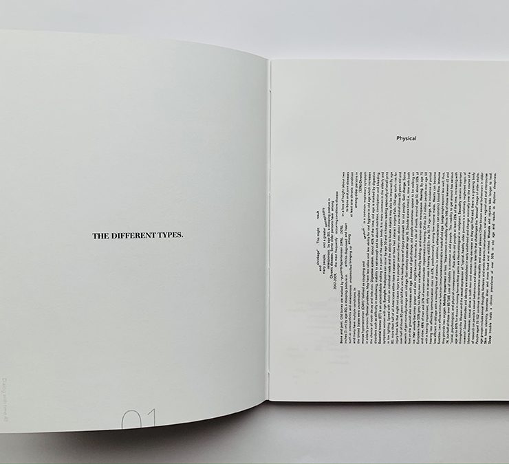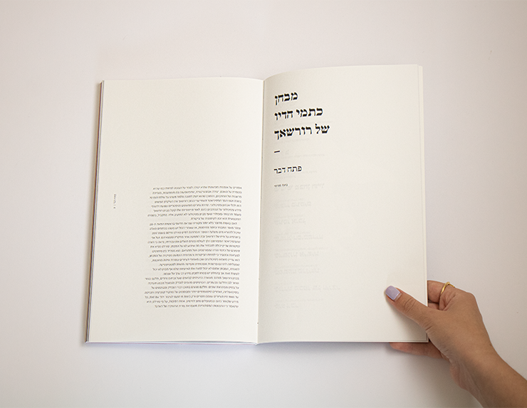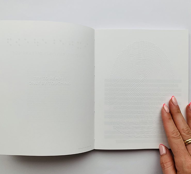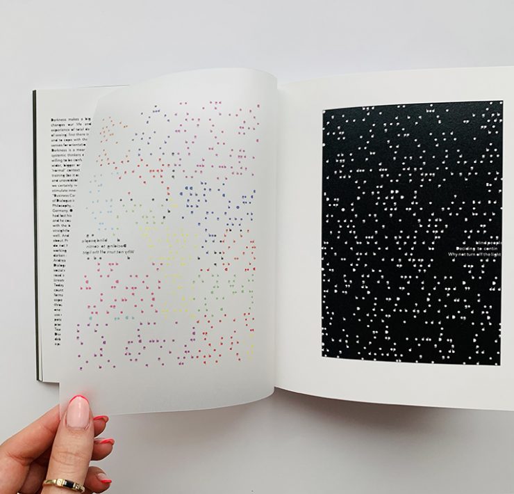 הקטלוג שלי עוסק בתערוכה ״דיאלוג בחשיכה״ שנערכת ברחבי העולם תחת הכותרת ״Dialogue Social Enterprise“. בתערוכה, אנשים ללא מוגבלויות חווים חוויה דומה למה שחווה אדם עם מוגבלות בחיי היום-יום. התערוכה מתחלקת לשלושה נושאים: ליקוי ראיה, ליקוי שמיעה וזיקנה. בכל פרק אני מזמינה את הקורא/ת לחוות את החוויות השונות דרך הטיפוגרפיה ומנסה לעורר להזדהות. עניין אותי לעבוד עם חוויה חושית דרך מגע בקטלוג עצמו. דרך הטיפוגרפיה ניסיתי לשנות את התודעה של הקורא/ת שעובר/ת חוויה מבלבלת, כמו להיכנס לעולמם של בעלי מוגבלויות, ולשאול שאלות לגבי התחושות השונות.
