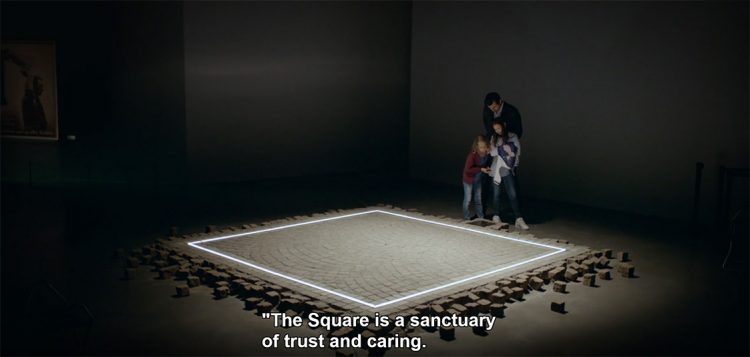המסקנה העגומה היא שהאמנות המודרנית היא לא רק ממוסחרת ונטולת משמעות, אלא היא גם מעודדת בני אדם שלא לשאול שאלות ולשתף פעולה עם הלך הרוח הכללי, עד כדי כך שהם הופכים אדישים לזולת. את כל זה כריסטיאן רוצה לשנות באמצעות תערוכה חדשה בשם "הריבוע". גם כאן מדובר באמנות קונספטואלית, מינימליסטית ומודרנית אבל הפעם יש גם מסר חברתי ברור. כל מי שעומד בתוך השטח שתחום על ידי הריבוע, מחוייב לסייע לכל מי שיבקש ממנו עזרה.