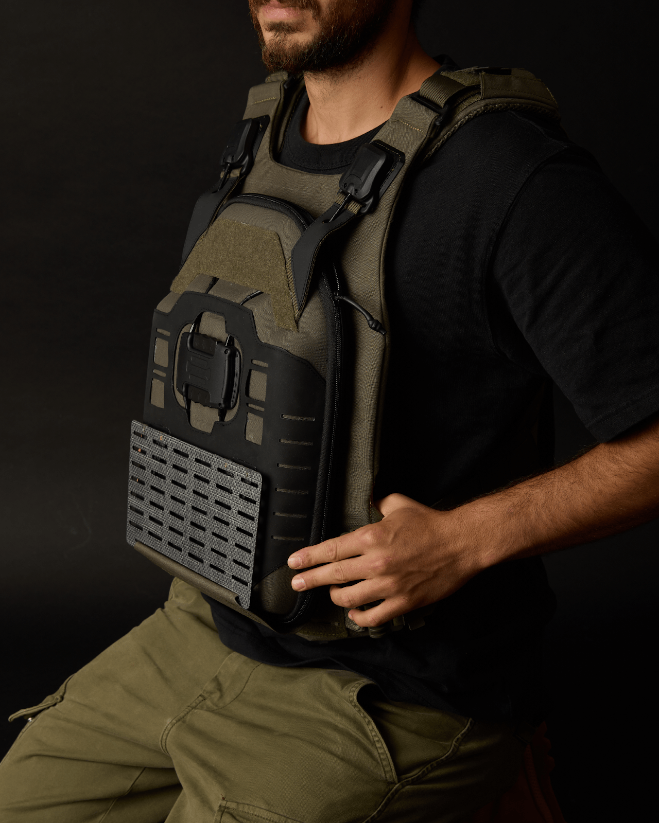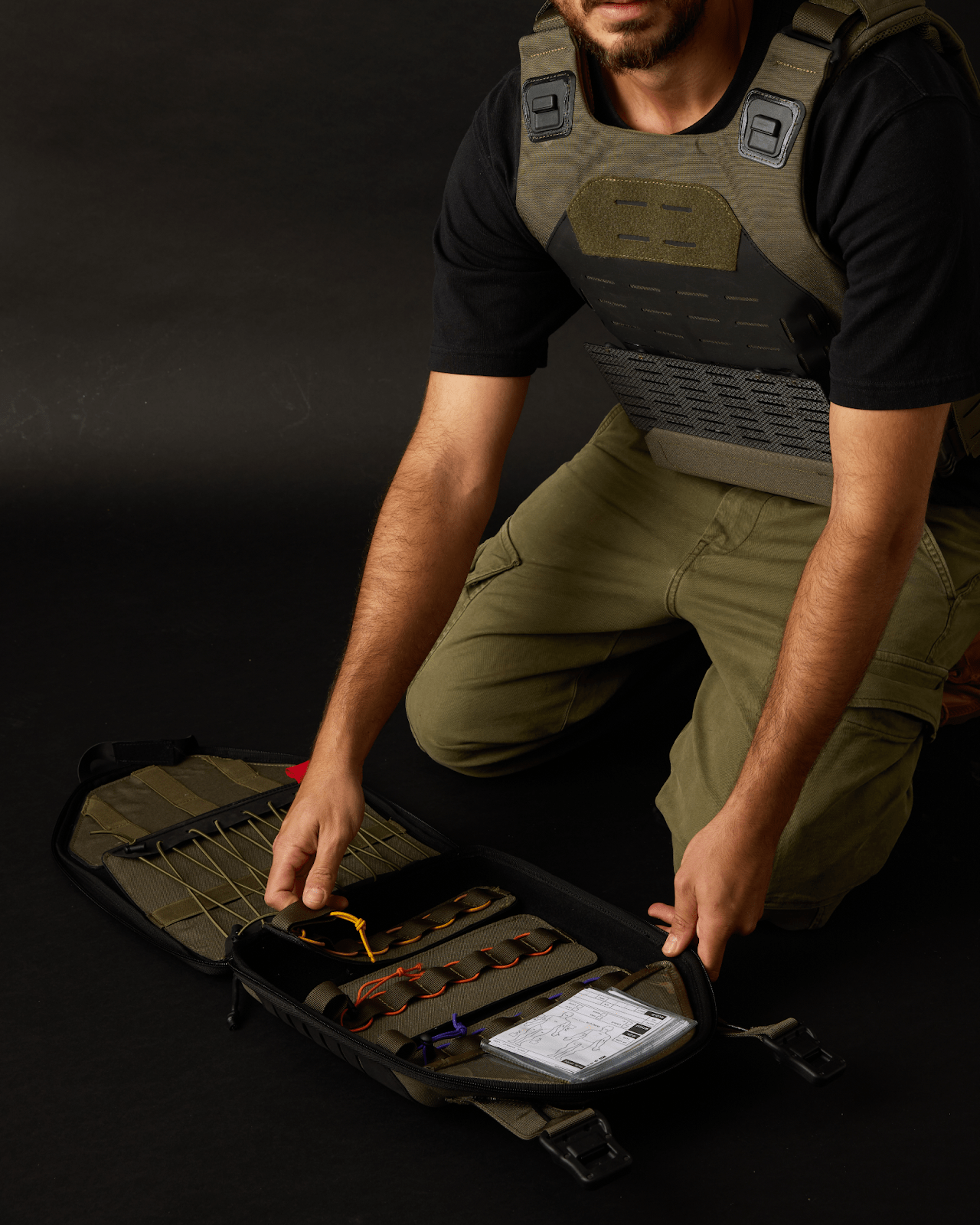 החידוש המרכזי שמציע הווסט הוא פאנל קדמי קשיח, מתרמופורמינג, הנשלף במהירות ונפתח לפריסה מלאה של הציוד הרפואי, כך שכל פריט נגיש מיידית – גם בעבודה עם מסייע (לוחם נוסף שמסייע לחובש בהגשת ציוד וטיפול בפצוע).
