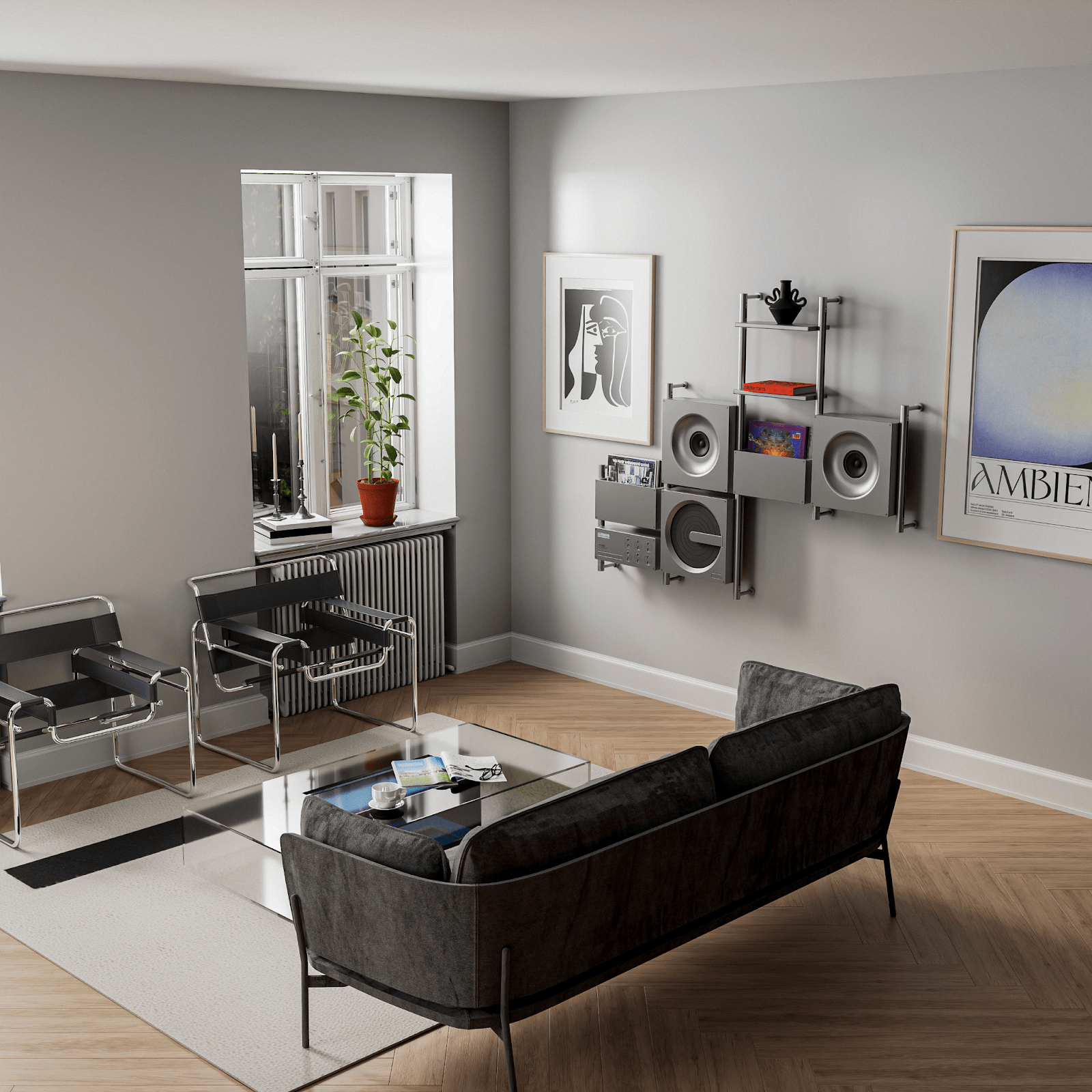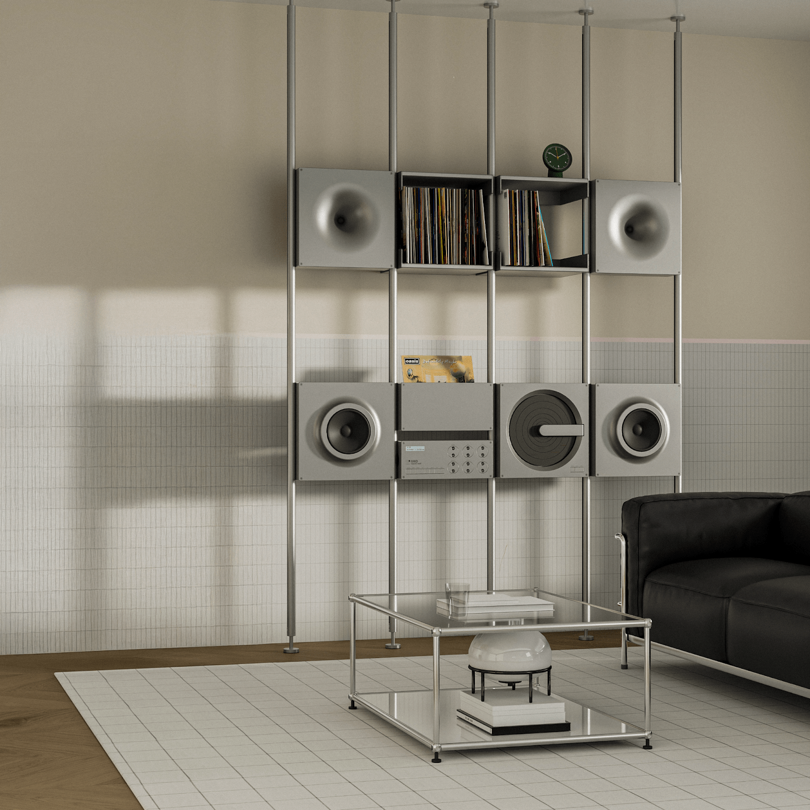 בחנתי מגוון פתרונות אפשריים לבריף שהגדרתי ובסוף החלטתי להתרחק מהקונסולה ולעצב אותה מחדש כספרייה. הרבה מהרמקולים המשמשים היום במערכות ביתיות קיבלו את השם bookshelf speaker מה שמרמז על היותם תוסף לספרייה. היה נראה לי מעניין לעצב רמקול שהוא הספרייה או ספרייה שהיא הרמקול. המערכת היא משפחה של רכיבי אלומיניום דמויי אריחים שמחוברים זה לזה באמצעות מוטות אנכיים, מהרצפה לתקרה או לקיר, יחד ניתן להרכיב מגוון אינסופי של קונפיגורציות בהתאם לחלל ולצרכים משתנים."