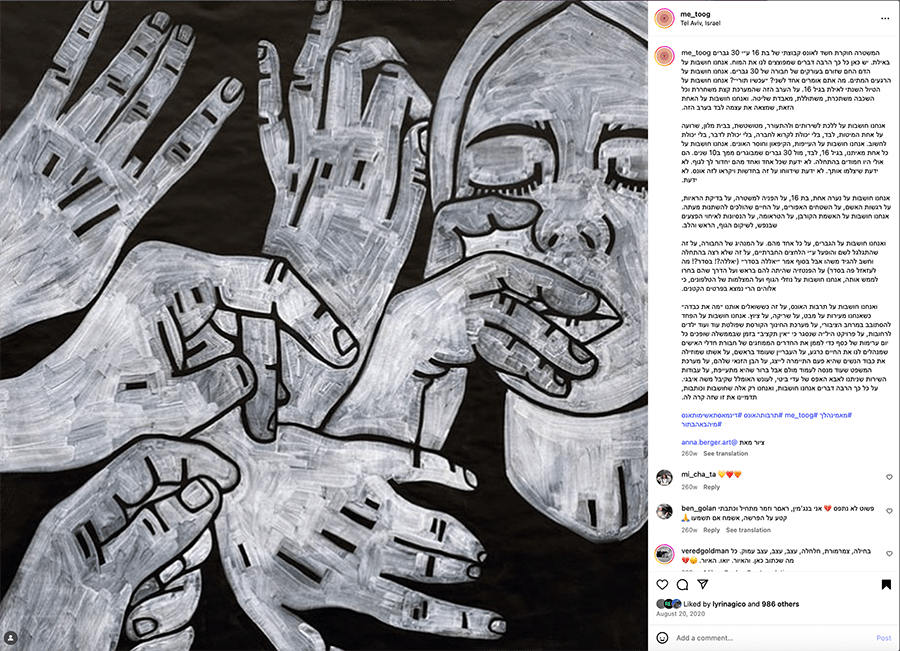 פוסט שדיבר על מקרה אונס שארע באילת והיה מלווה בציור של אנה ברגר, בצירוף הטקסט שכתבתי, נגע למאות, הובא ל־Timeout ולצינור.
