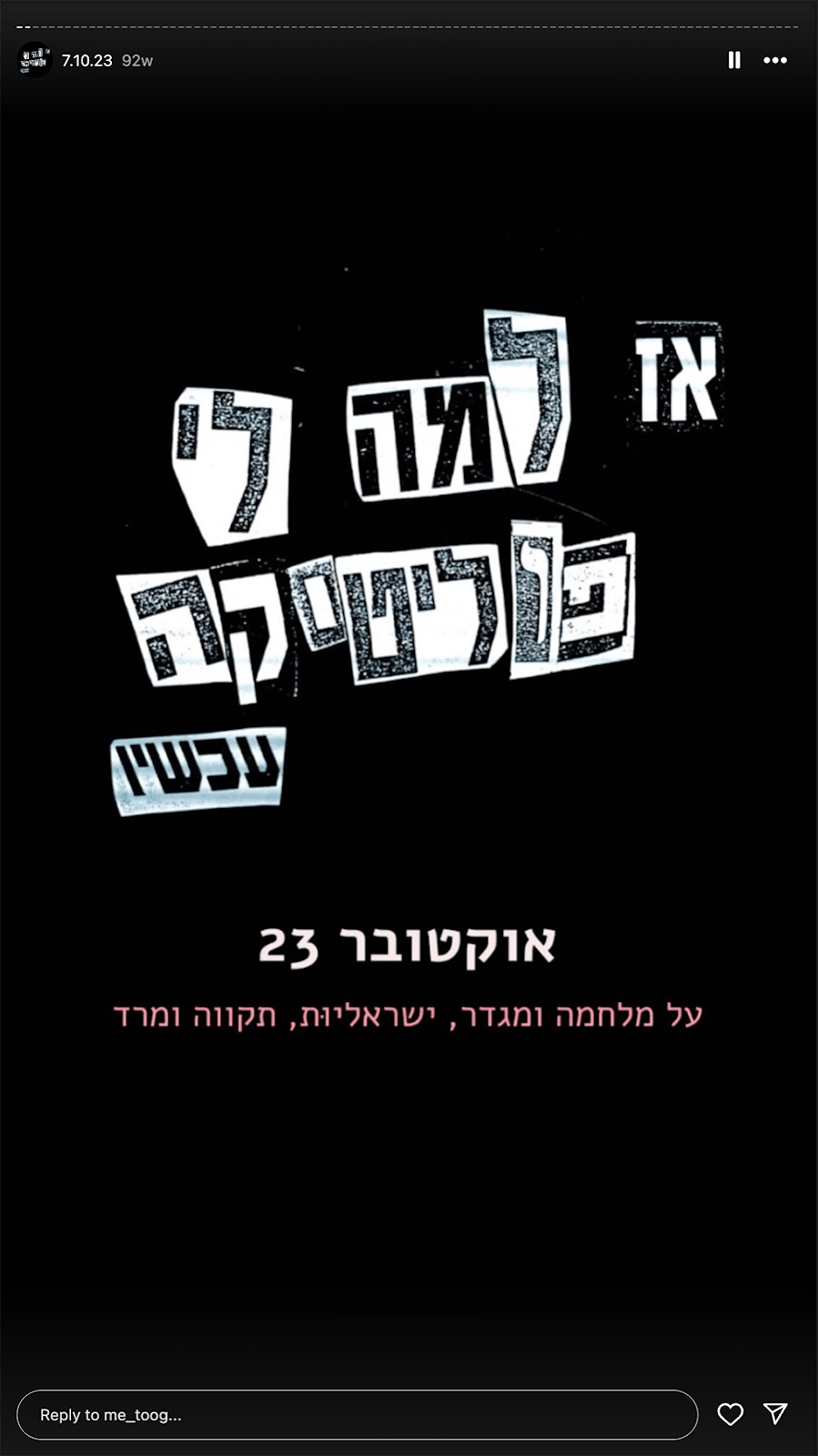 פוליטיקה בוערת בי מאז הילדות. בעמוד יש לי מעין ‘חסות עיתונאית’ – אני משתפת פעולה עם יוצרות על מה שבלב סדר היום הציבורי. לדוגמה, בסדרת סטוריז ‘מלחמה, מגדר, ישראליות, תקווה ומרד’ יצרתי רצף ויזואלי של התמודדויות אישיות וציבוריות.