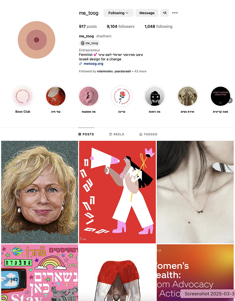 me_toog הוא הרבה יותר מעמוד אינסטגרם — הוא קול ברור בשדה הפמיניסטי המקומי. דרך עיצוב גרפי ופרויקטים חברתיים יוצרות העמוד נוגעות במגדר, גוף, מיניות, בריאות נשים, חברה ופוליטיקה. בין פוסטים, סטוריז ופרויקטים מיוחדים, me_toog הצליח לייצר לעצמו קהילה חמה של נשים (וגם גברים) שמוצאות בו בית, מרחב בטוח וגם מקום לחשוב, להרגיש ולפעול.