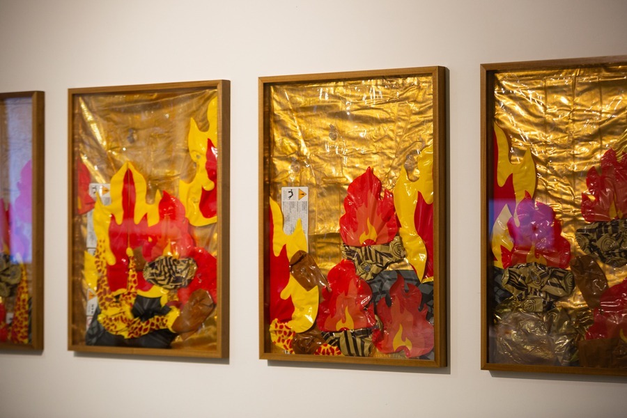 כך נולדות גם עבודות ספונטניות: למשל בזמן ההפגנות נגד ההפיכה המשטרית, אחרי שהדליקו מדורות באיילון, חזרתי הביתה המומה. באותו ערב עליתי לסטודיו, שלפתי צמיגים ולהבות מתנפחות ותוך שעתיים נולדה יצירה חדשה שמוצגת היום בתערוכה."